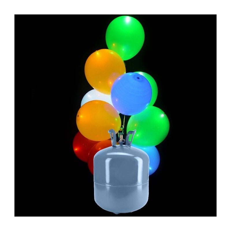 Per questa ragione ti offriamo un pack elio composto da una bombola di gas elio di 0,25 m3 di capacità, 30 palloncini led e un rotolo di nastro per legare i palloncini dove preferisci.