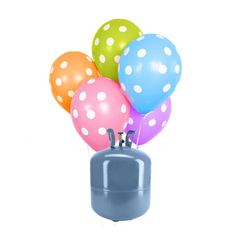 Troverai una bombola usa egetta, con quantità sufficiente per gonfiare la''incirca 30 palloncini da 25 cm di diametro.